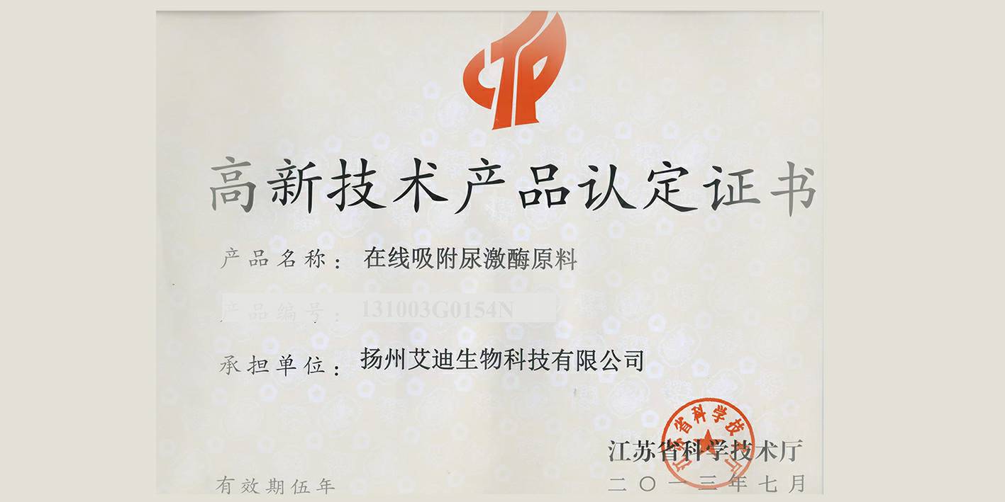 • 在线吸附尿激酶原料获得2013年江苏省高新技术产品认定