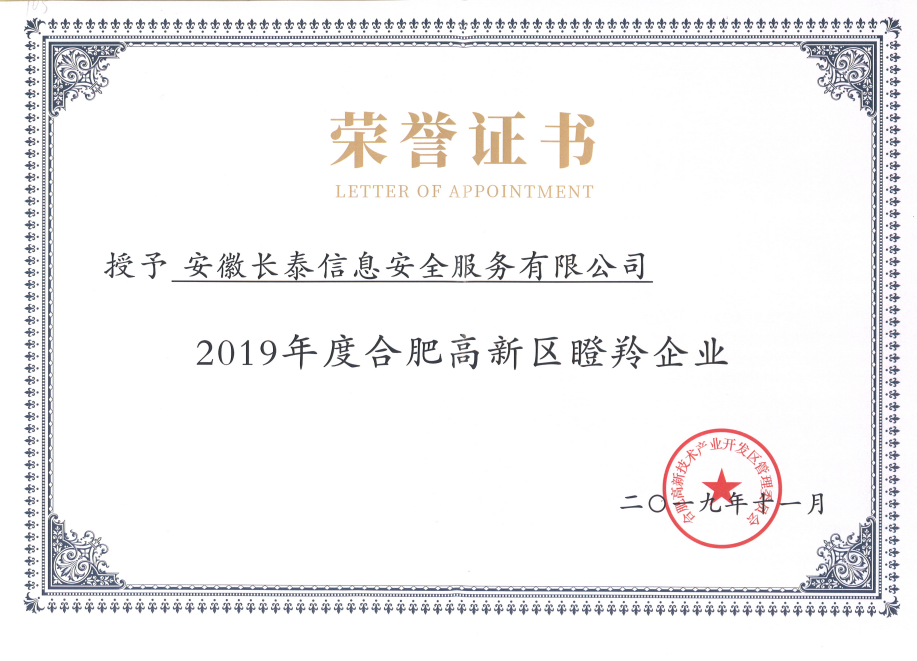 2019年,11月20日,合肥高新区2019年高成长企业榜单正式发布,高新区共认定了502家高成长企业,其中雏鹰企业275家、瞪羚培育企业72家、瞪羚企业149家、潜在独角兽企业3家、独角兽企业1家、平台型龙头企业2家。作为其中的高科技企业——安徽开云官方站手机网站登录入口-开云(中国)成功入选瞪羚企业榜单。